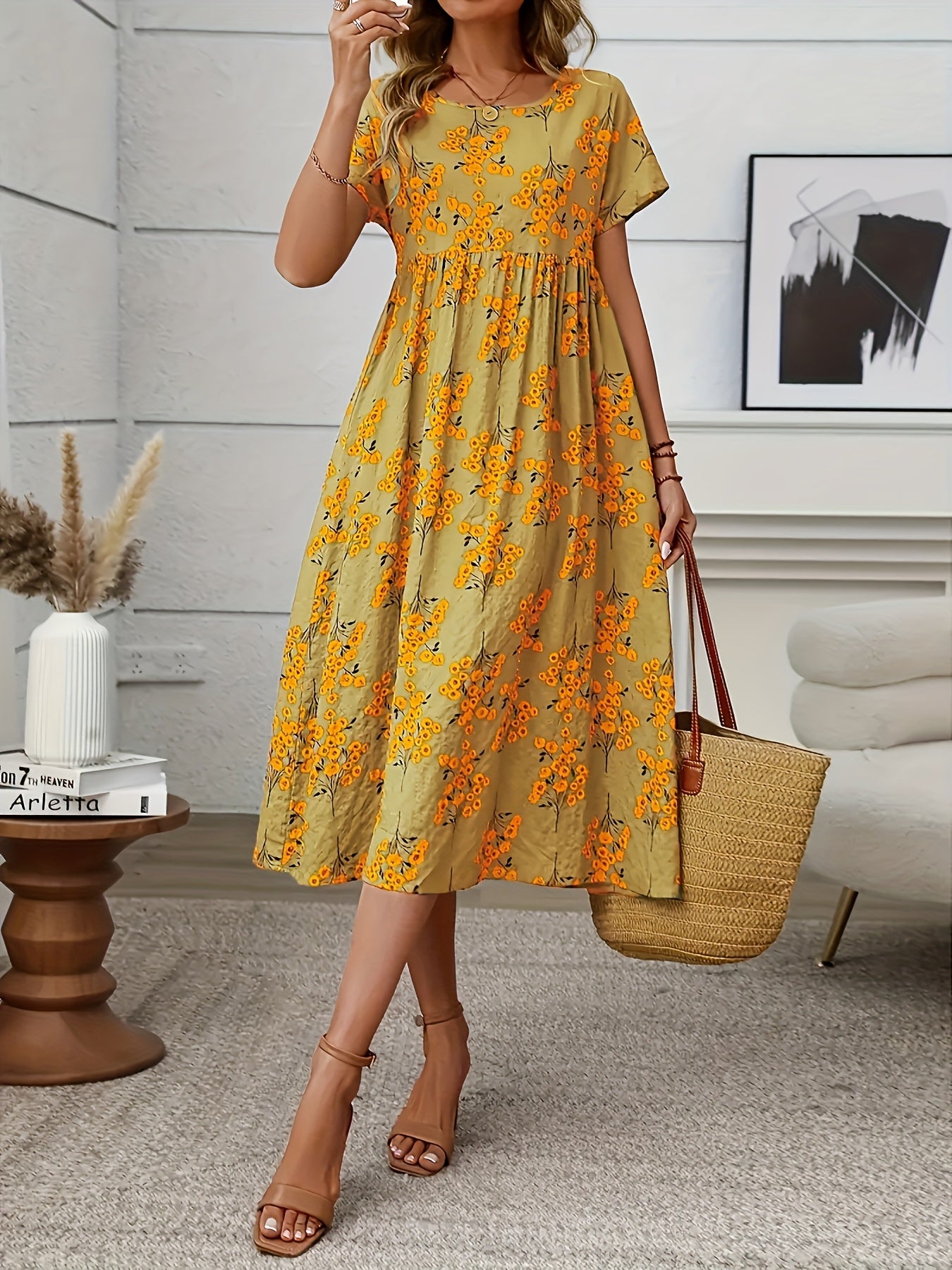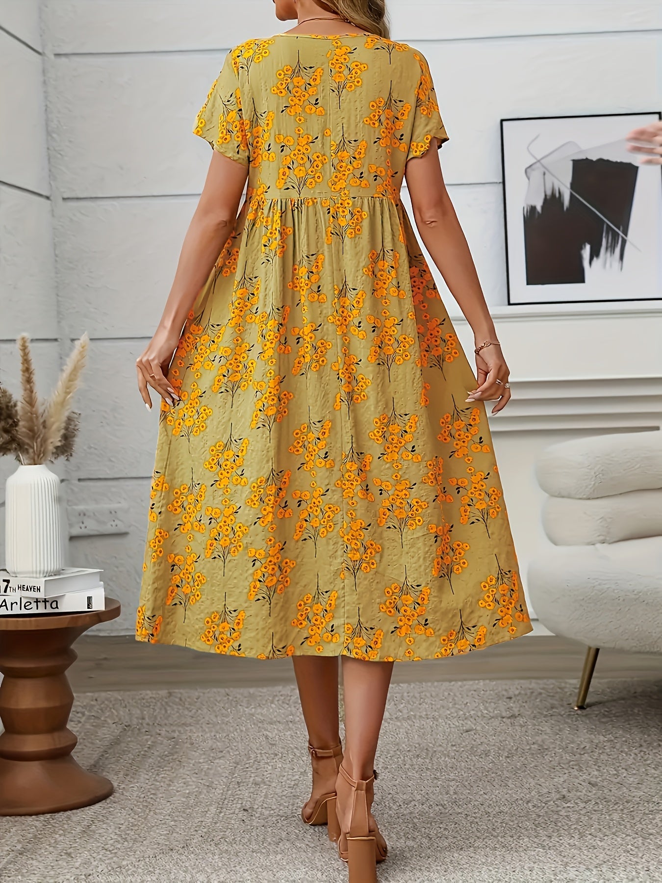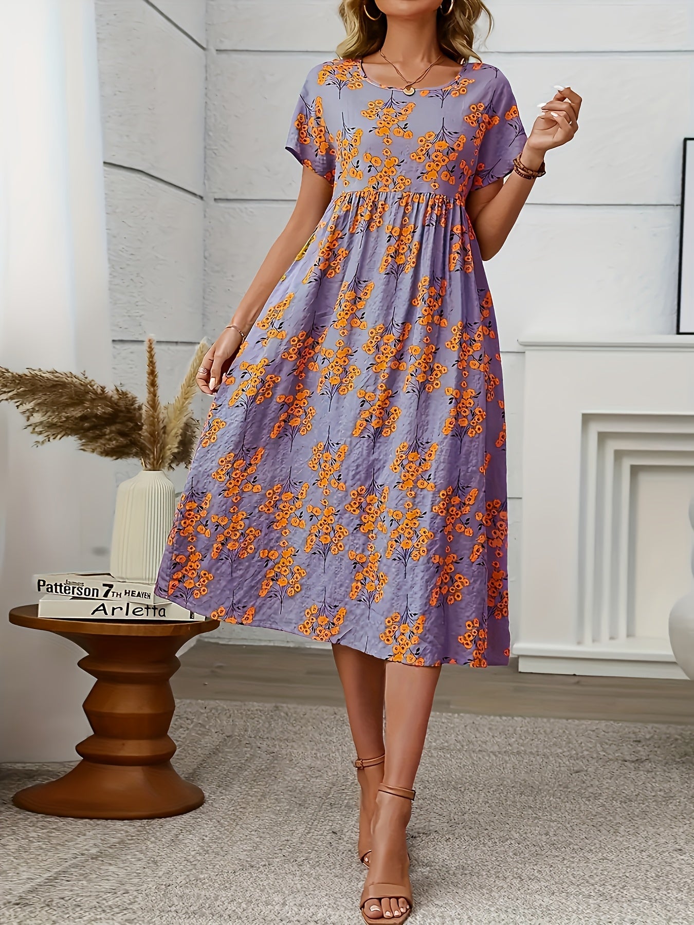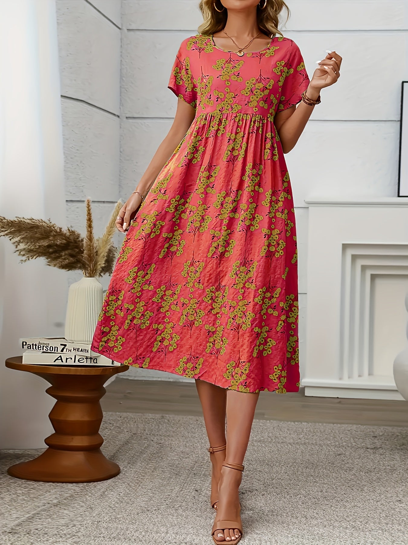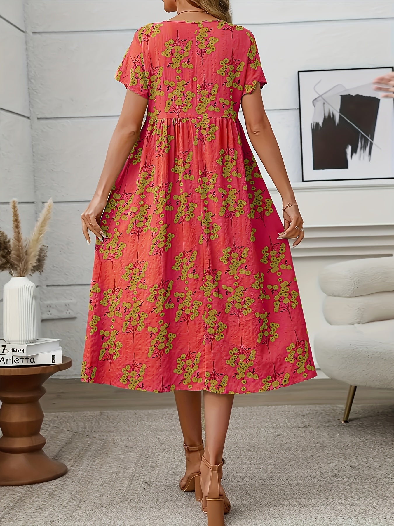 This cheerful coral midi dress with delicate floral patterns brings a playful yet elegant vibe to your wardrobe. Its relaxed silhouette and lightweight design make it perfect for sunny days, garden parties, or casual outings.